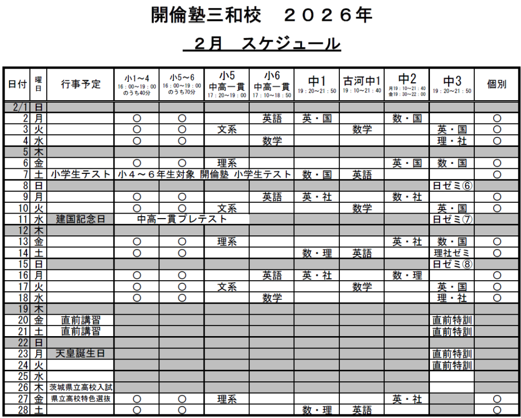 ・特別授業のお知らせ ・三大検定のお知らせ ・お休みのお知らせ
