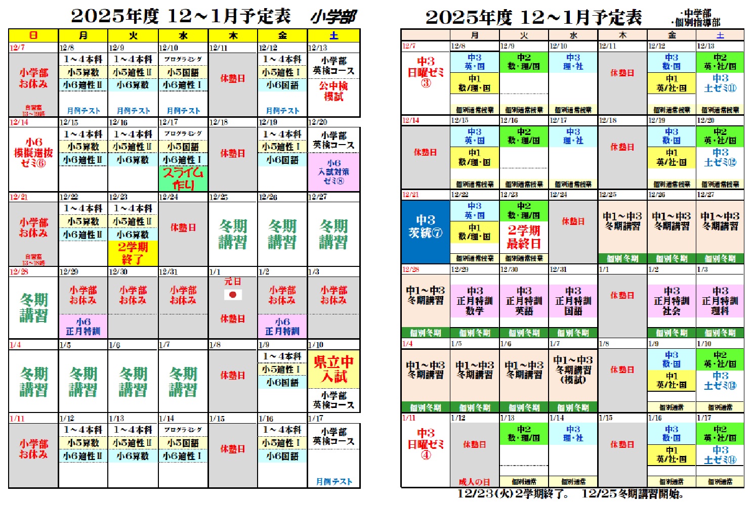 12月~1月の予定表