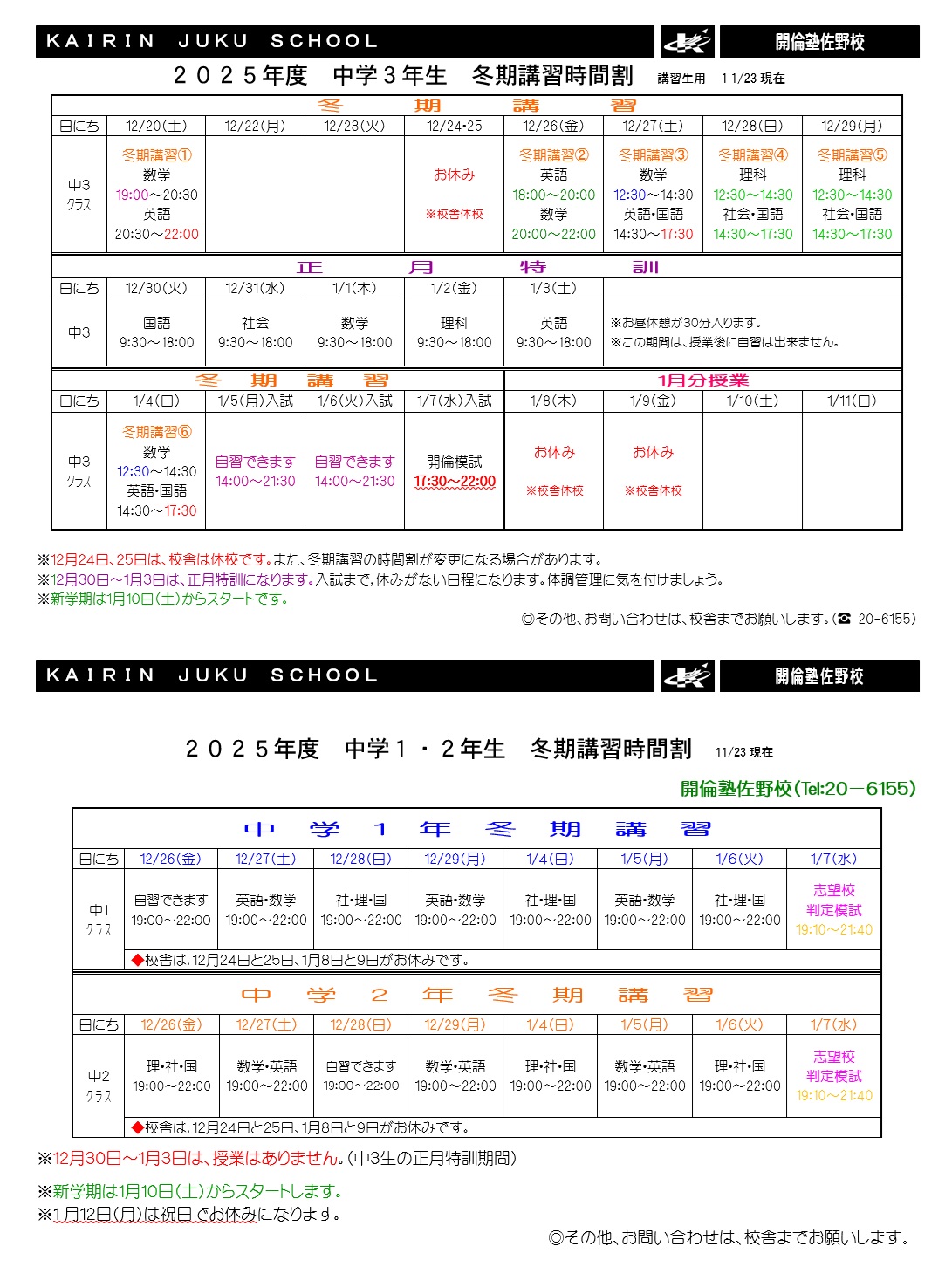 12月26日(金)~2026年1月7日(水)の期間、小学1年生から中学3年生を対象に冬期講習を開講。