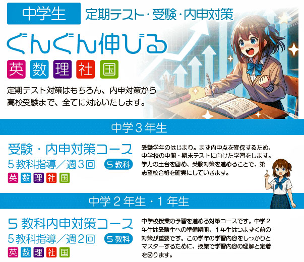 基本的には5科目指導になります。各中学の学習内容を先取り学習します。
