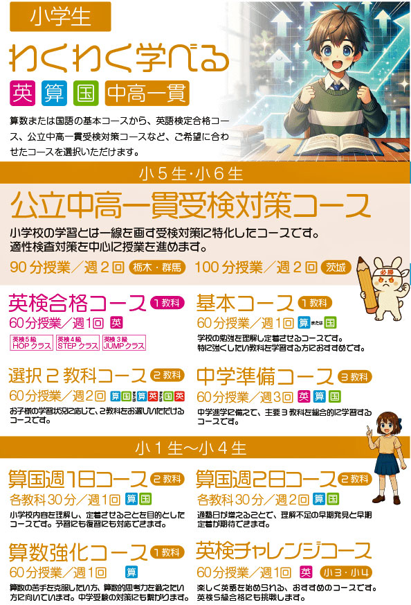 算数と国語は、学校の学習内容より少し先を行う予習型で授業を進めていますので、学校の授業がわかりやすいはずです。また、補習や自習室を活用してしっかり復習することもできます。小学1年から4年生までは、少人数制で行っておりますので一人ずつのペースで進められます。また、今年度より小5・6年生対象に『英検コース』をスタートさせました。5級・4級・3級と取得を目指す級ごとにクラスが分かれています。それから、小5・6年生対象に佐野高校附属中学受験対策として『中高一貫コース』が開講してます。