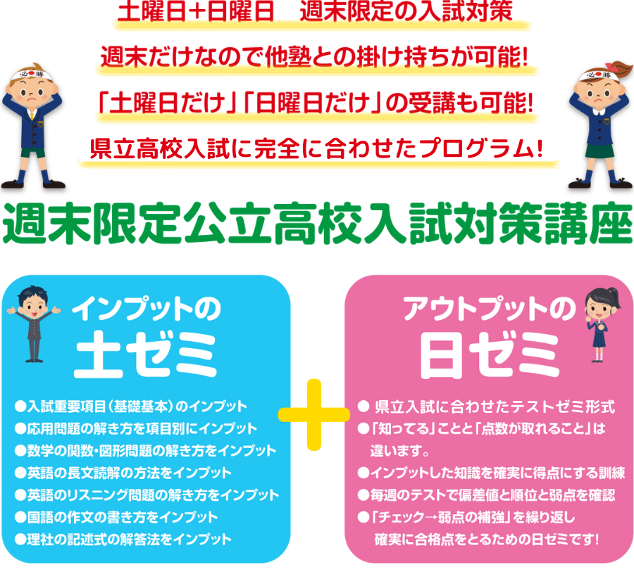 ・長期の休みには春期・夏期・冬期講習があり、中3生はさらに、土曜ゼミ・日曜ゼミ、お盆・正月特訓、県立入試直前講習と、強固なカリキュラムをご用意し、志望校合格へと皆さんを導きます。