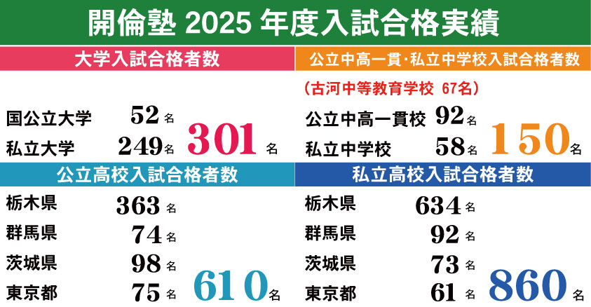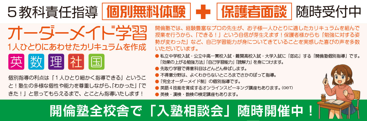 | 行事 | 開倫塾模擬テスト、季節講習、定期テスト対策、三大検定、入試対策ゼミ、お盆特訓、正月特訓、推薦入試対策ゼミ、Vもぎ、高校準備講座など |