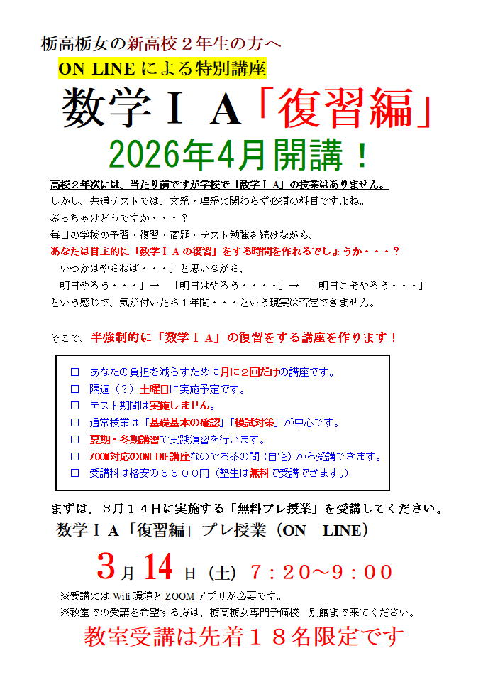 私どもの教室は「栃高栃女専門予備校」として、栃木高校・栃木女子高校の授業進度や学校行事に寄り添った指導をしております。高校の授業・テストの成績における不安、大学受験に関する不安がございましたら、ご遠慮なくご相談ください。お役に立てる自信があります。